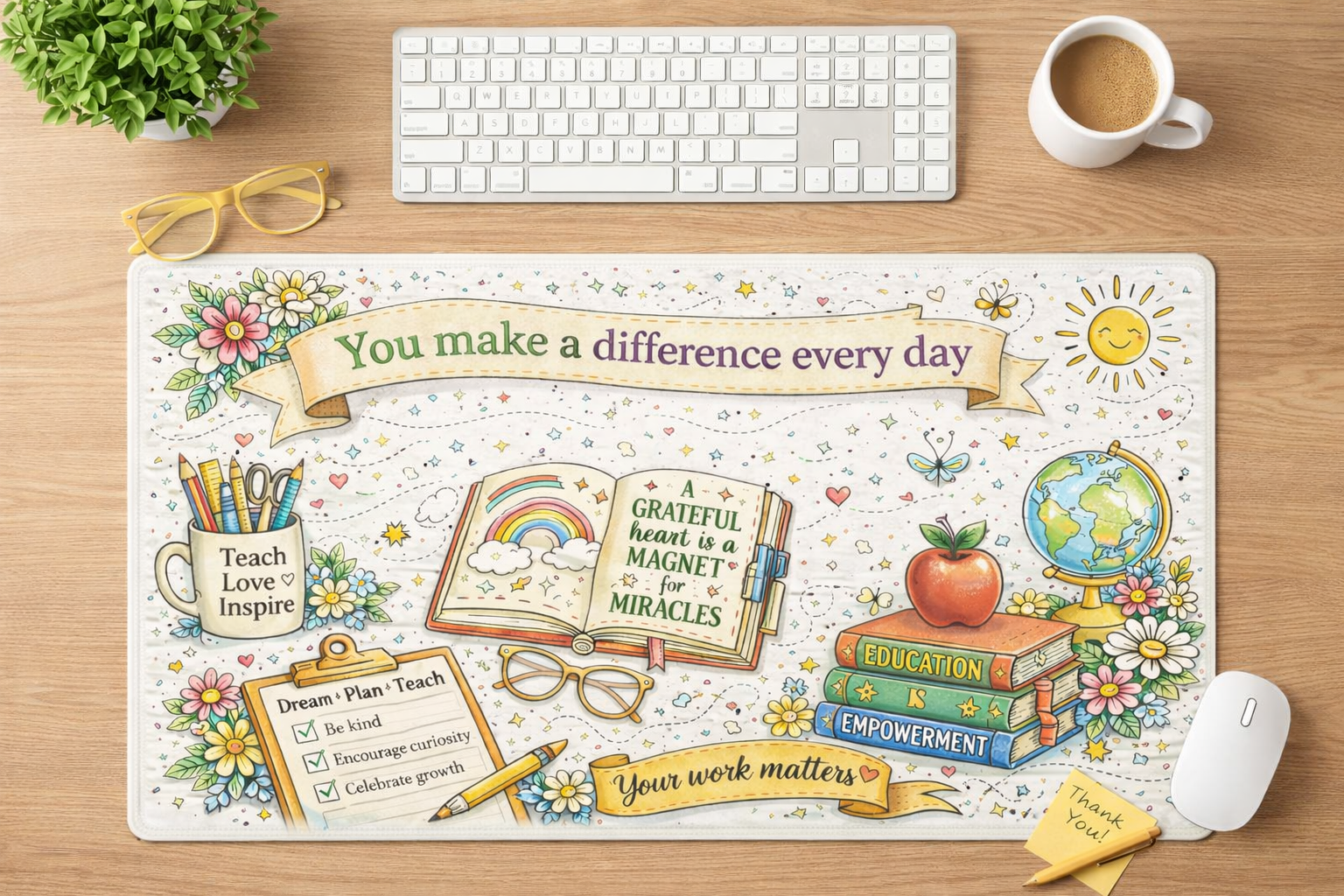 Bring inspiration, warmth, and purpose to your workspace with this beautifully illustrated teacher desk mat. Designed with intention and heart, this desk mat is more than décor—it’s a daily reminder that your work truly matters. Perfect for classrooms, home offices, or lesson planning spaces.